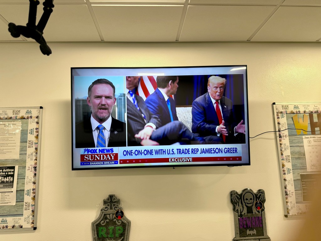This morning, the large TV in the hall of the community center is playing Fox News, highly political and inappropriate for a polling site.