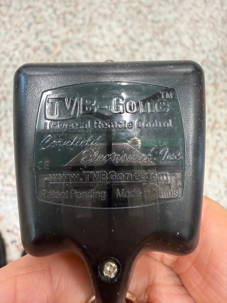 The young elections worker sitting nearby would prefer to see the football game, however the TV controls are in a locked-off area so the Clerk cannot change the channel or even turn off the TV. While she ponders the problem, I trot to my car and return with my TV-B-Gone, an electronic device the size of a matchbook that turns off any television.