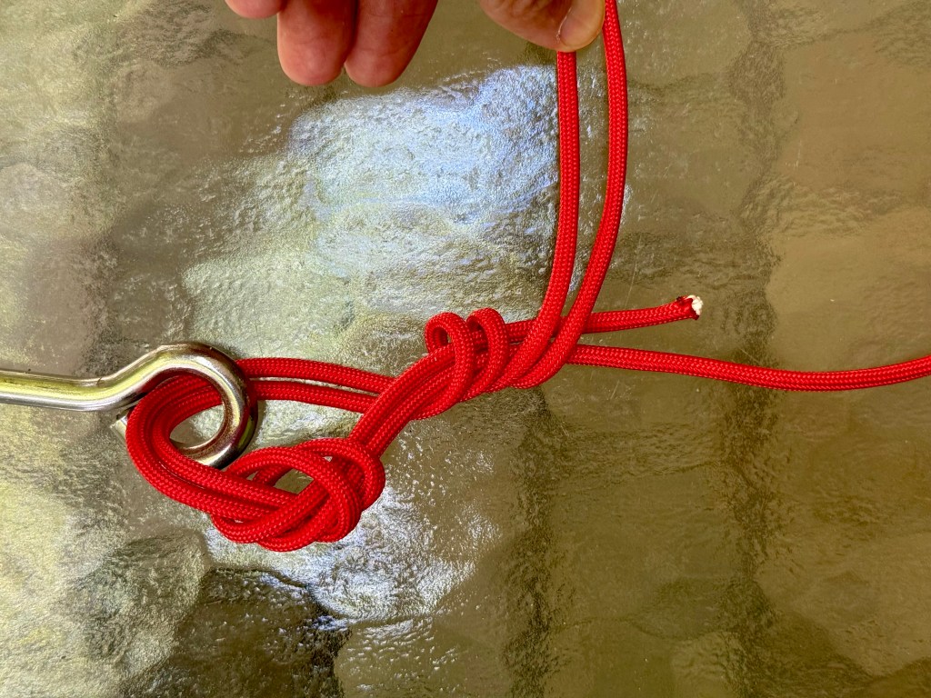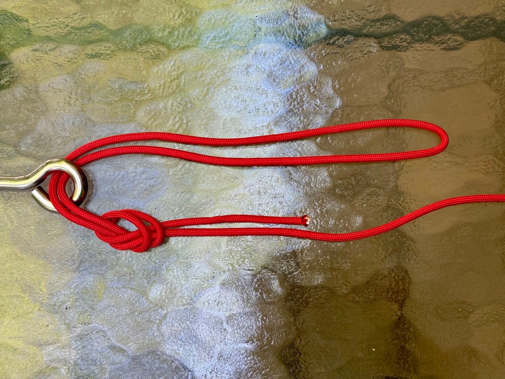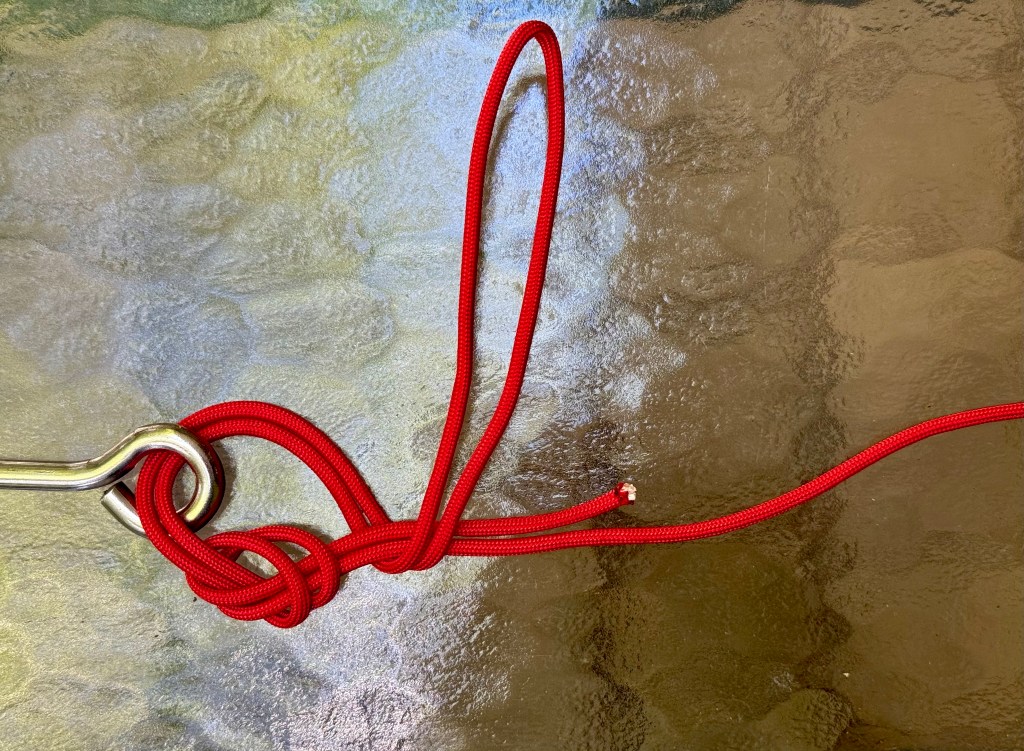 The working knot, like the one above, is tied in thin monofilament or fluorocarbon leader that is hard to visualize from a photograph. In the photos that follow, I tie the knot using parachute cord to make it easier for you to see.