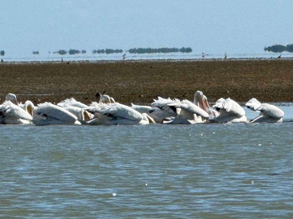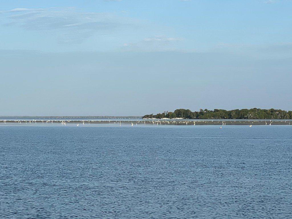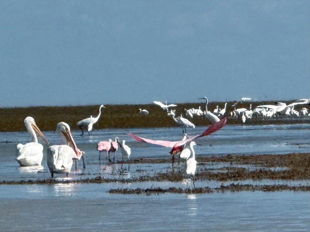 White Pelicans fishing cooperatively for mullet.Black Skimmers leaving the flat as the tide rises.White Pelicans, Great White Herons, Great Egrets, Roseate Spoonbills, Snowy Egrets, all fishing the shallow run-out at dead low tide.