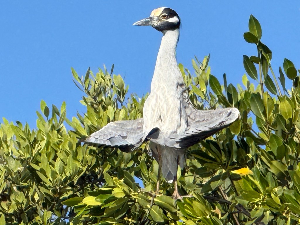 Reddish Egret takes refuge from the high tide on a mangrove island.Yellow-crowned Night heron practices the Angeli Mudra yoga pose.Roseate Spoonbill looks down to assess the water level while waiting for the tide to recede.A Mangrove Clapper Rail skulks through the matted seagrass caught in the mangrove roots.