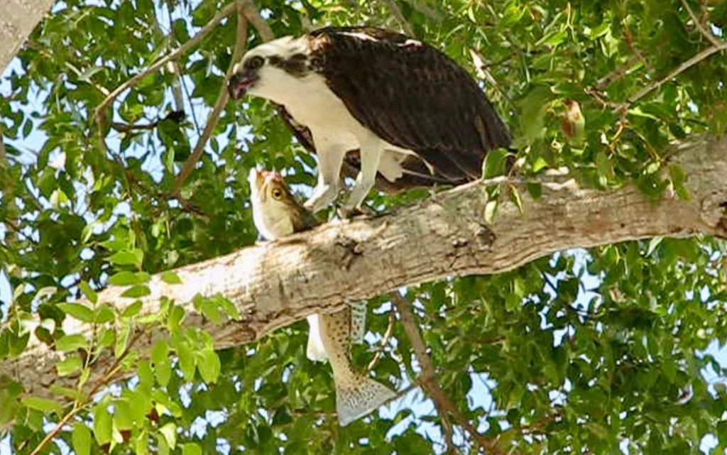 I paused to watch eight Ospreys circle a mullet school, diving in succession, snatching hapless fish, and landing in the trees on shore to enjoy a sashimi breakfast.