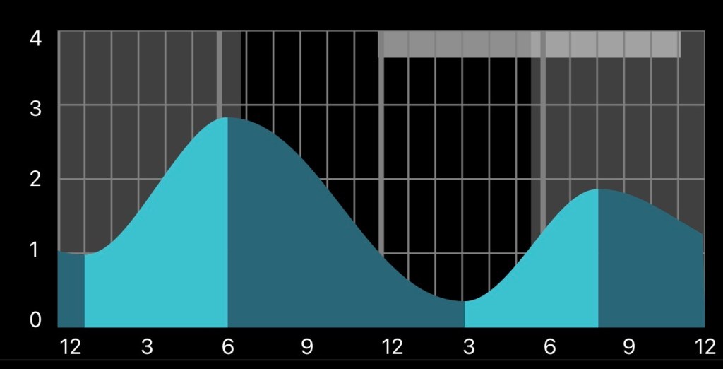 Tide chart for Flamingo on 26 Nov 2025. The black band in the middle is daylight and the gray bar at the top is the moon. The tide on the flat we are fishing is delayed by an hour. It will fall for eight hours, from 7:45 am until 4 pm .